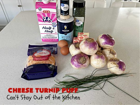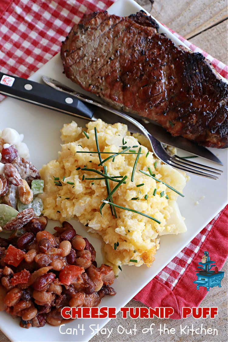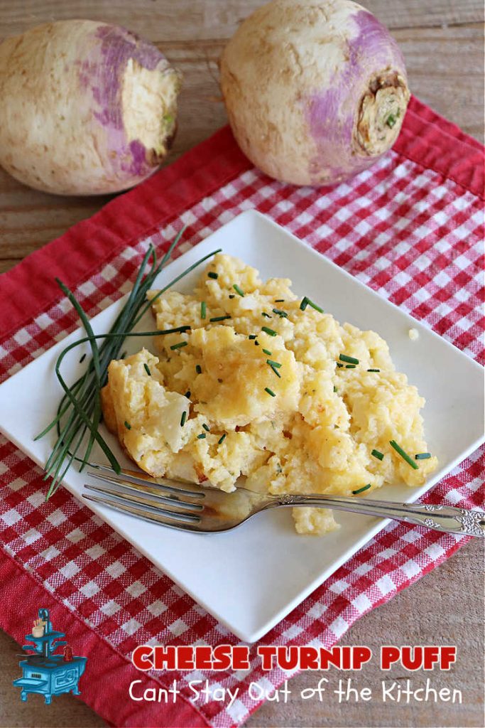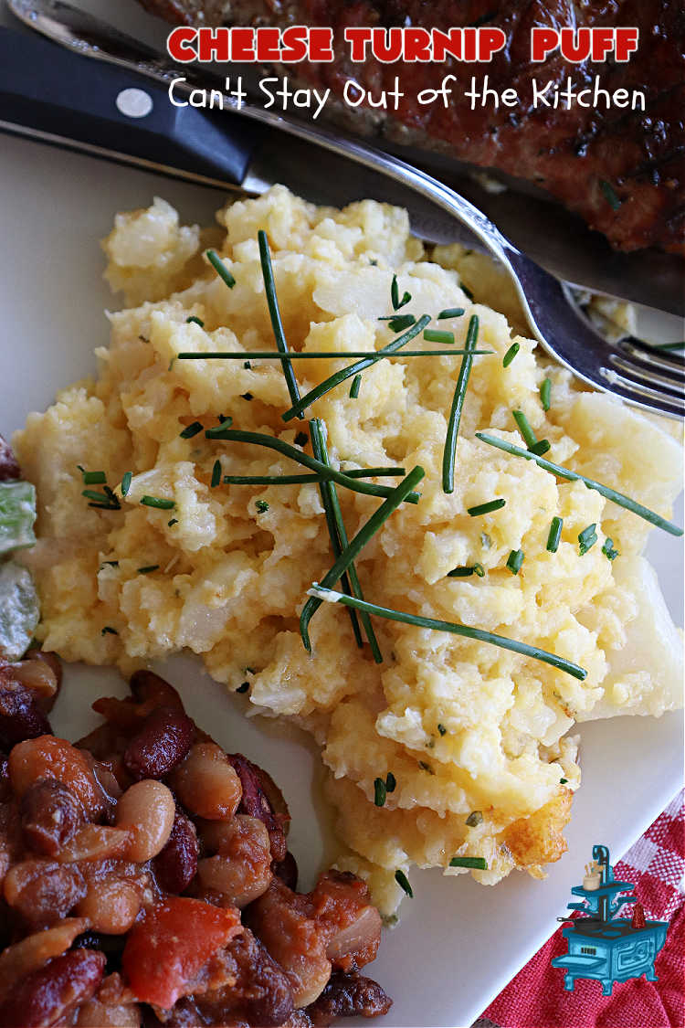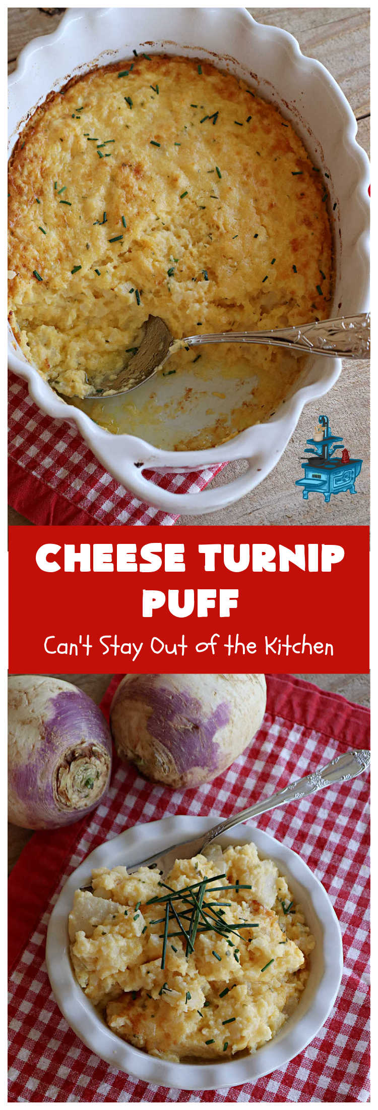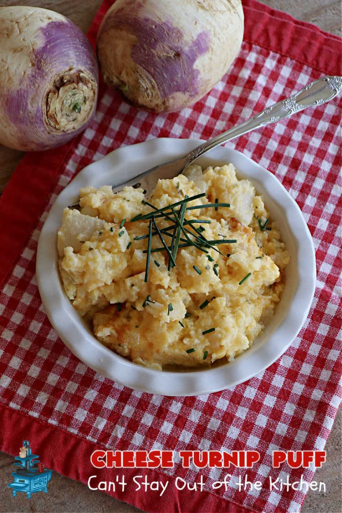 I served Cheese Turnip Puff with a steak, Partytime Beans and Nutty Apple Salad when I made it. It was terrific with all of those well-seasoned foods. I am determined to find ways to enjoy this cruciferous vegetable and hope you enjoy some of my suggestions.