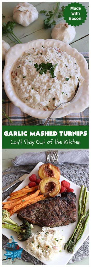 The thing about turnips is that they have a very sharp flavor, much like radishes and parsnips. If you didn’t grow up eating them, you have to find creative ways to enjoy them. One of my favorites is Garlic Mashed Turnips. These are made like Garlic Mashed Potatoes except they include bacon and the bacon grease is included in the recipe. It is a lip-smacking recipe that’s so satisfying that you won’t even believe you’re eating turnips!