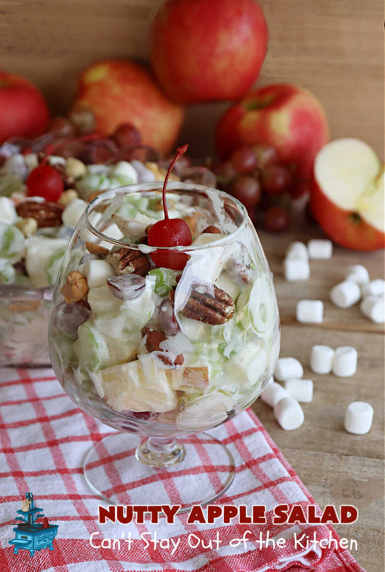 Nutty Apple Salad is a light and refreshing fruit salad that includes apples, grapes, celery, marshmallows and mixed nuts. It’s a terrific company salad for backyard barbecues, grilling out with friends or holiday get-togethers. Gluten free.
